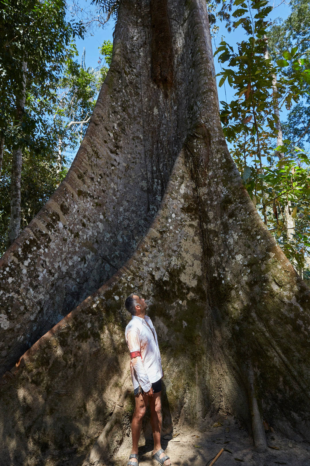Francisco Costa: I came across my first Mother Tree, a centuries-old monumental structure that can stand as tall as 260 feet, during my time along the Jari River, a northern tributary of the Amazon river in Pará. I remember feeling incredibly small as I looked up at her giant trunk and branches, which no doubt weathered more tortuous storms than I could imagine. And I remember the trees that stood beside her, their silhouettes more slender but substantial nonetheless, and how they swayed with the sun as if they were dancing to the same song.