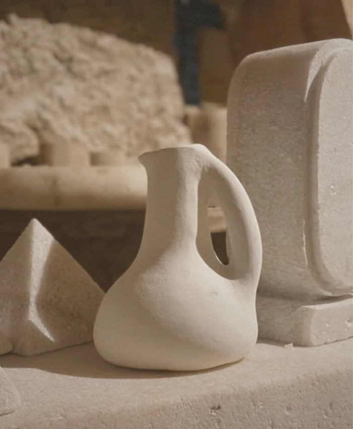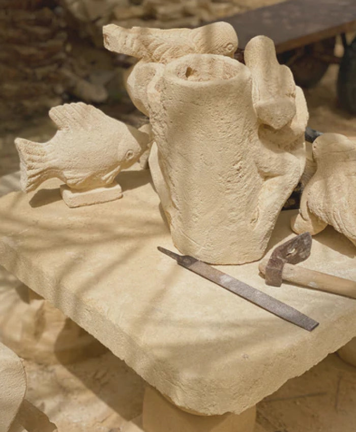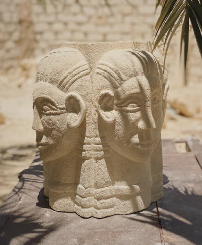 "I carved salt into an Egyptian cartouche-shaped block, which I will convert into a lamp stand.Another material I’ve been working with is limestone. When I arrived two months ago, I met this carver who I started working with, and together we have been developing my drawings into sculptures. The first piece is a rectangular block with its four sides shaped in the face of Hathor, goddess of love in the Ancient times. Hathor has been very generous to me lately so I wanted to celebrate her magical powers and presence!"